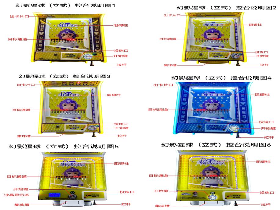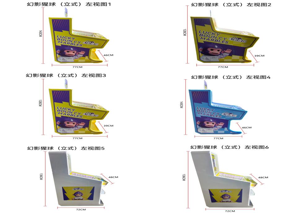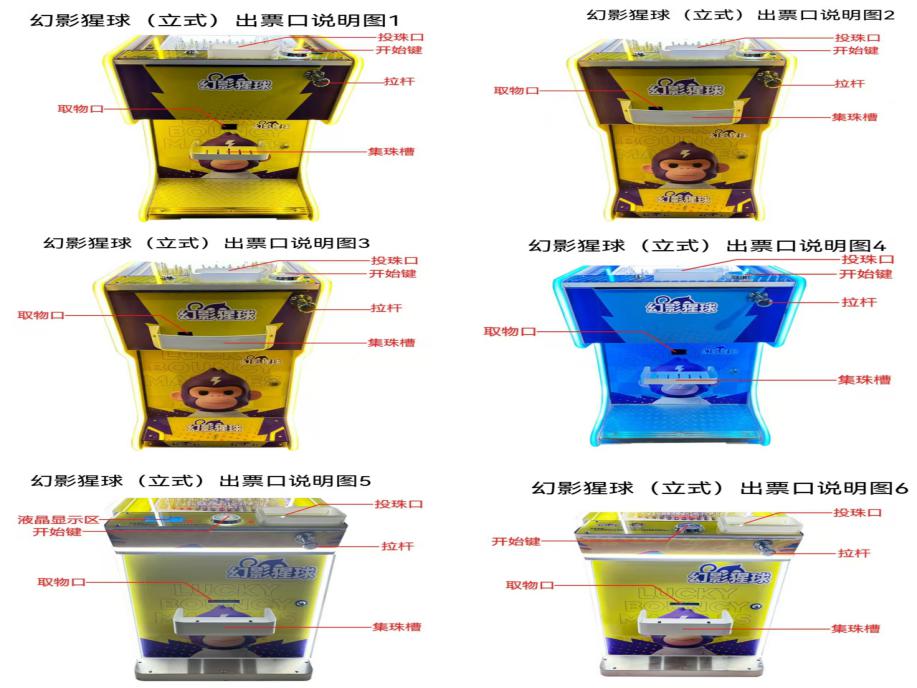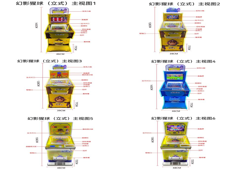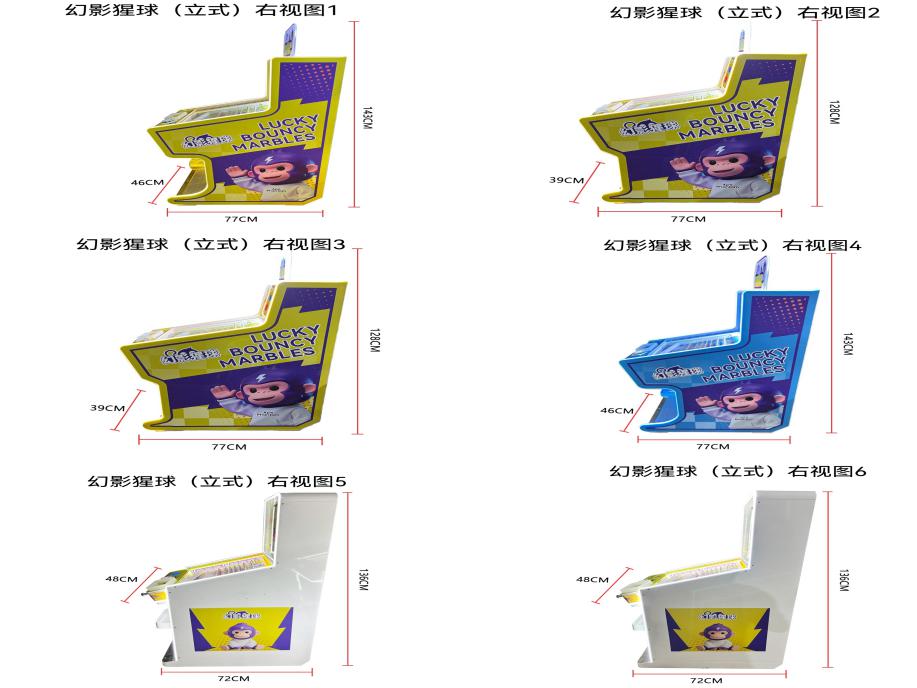 游戏内容简介 | 《幻影猩球(立式)》是我公司专为大众娱乐而自主设计研发的一款弹珠竞技游戏,是一款趣味性很强的弹球竞技性互动游戏设备,本设备外观集合潮玩元素,支持多款机型颜色可选:黄色、蓝色、橙色。以及人物IP设计,采用木板、亚克力、五金等材料完美结合。本机适用于动漫城、超市、商超、台球俱乐部、电影院等符合经营许可的使用场所。游戏设备是一款用来促进亲子亲情的游戏娱乐设备,采用的主题是弹珠达人,概念是阐述着孩子们玩玻璃珠等休闲欢乐的童年回忆!借此鼓励父母多多带着小孩子们,外出郊游,呼吸新鲜空气,锻炼身体,也可以一起游戏,进而拉近父母和小孩的亲情互动,一起完成游戏目标,共同获得欢乐的感觉。本机支持合法合规的管理系统,也可通过打开微信或支付宝扫一扫管理系统卡头二维码/屏幕二维码/实体二维码扫码支付投币或投入实体游戏代币购买相应的玻璃/塑料/陶瓷珠。机器上方有数码显示区或者液晶显示区,玩家将玻璃/塑料/陶瓷珠从投珠孔内投入便可以开始游戏,机器里面有一个游戏的钉子阻碍板,钉子阻碍板上有12个落球轨道,每局会随机亮一定数量的轨道,拉动拉杆,把母球往上弹,母球通过钉子阻碍板上的钉子碰撞后,经过其中一个轨道落下,如果母球经过的轨道是亮灯的轨道,则表示中奖,中奖后机器内部的出珠盒会自行转动,可选退出卡片、二维码兑换票、玻璃珠/陶瓷珠/塑料珠等等。如果母球经过的是不亮灯的轨道,则表示没有中奖,不进行奖励。机器功能简单明了,玩弹珠设备可以促进孩子们手脑协调,控制母球掉落目标通道完成任务,得到奖励的惊喜与欢乐感。 | ||