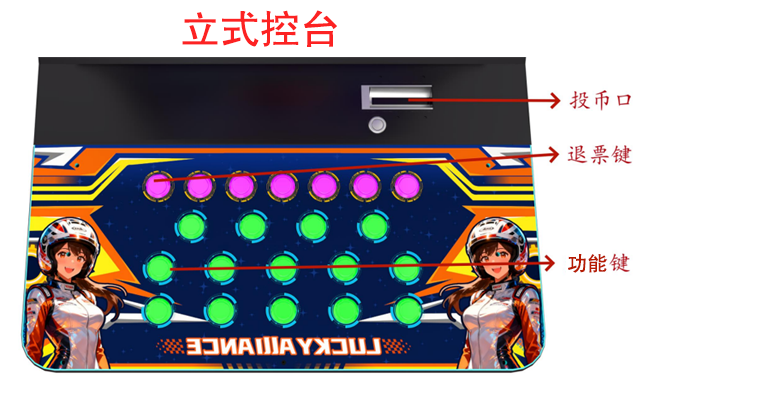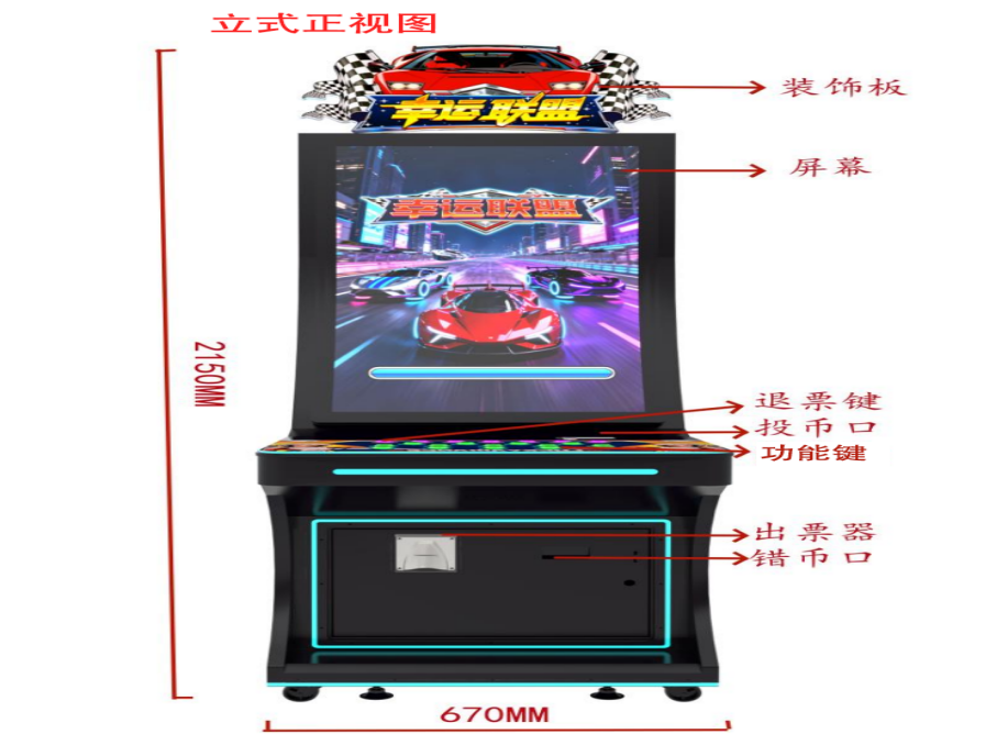 游戏内容简介 | 【幸运联盟(立式)】本游戏背景是城市街道为主题,游戏有城市公路和城市水上公园等场景玩法,后台可设置每种玩法。游戏比赛不仅展示了参赛者的技巧和耐力,也吸引了大量观众现场观看,成为了当地的一项重要体育活动。玩家扮演的观众选择不同号码的赛车或飞艇进行加分数,本游戏可单人或多人连机同时进行联网比赛游戏。本机支持合法合规的管理系统,也可通过打开微信或支付宝扫一扫管理系统卡头二维码/屏幕二维码/实体二维码扫码支付投币或投入实体游戏代币等方式获得对应的竞猜分数后玩家即可开始游戏/或等待机器自动倒计时。本机适用于网咖、竞技馆、动漫城、商超、台球俱乐部等符合经营许可的使用场所。比赛开始时,发令员发令后,各飞艇或赛车以最快的速度冲向终点,以飞艇或赛车首到达终点的先后判定比赛名次。在一定时间停止后,根据玩家增加赛车或飞艇分数的程度通过伺服务主机连机获得比赛结果而得到不同的彩票分数。本机台支持43寸或32寸曲屏直屏,有白天和夜晚二个普通场景,如果游戏成绩出色的话,还能进入华丽广袤的星空和星云场景。分数获相应的彩票奖励。游戏里面内置小游戏环节,在游戏过程中会出现赠送大彩票环节和“开心时刻”环节,在规定的30秒时间内,玩家用最快的速度拍打按钮,按钮拍的次数越多,则送出的彩票越多,直到时间结束,玩家拍的手速异常激烈,游玩时如果给所有的赛车或飞艇号都拍打按钮,速度越快越有机会获得更多彩票。当分数为零时,游戏结束,则根据当前捕获的奖励分数,退出对应数量的彩票。玩家可用获得的实物彩票/电子彩票,可到店面吧台用彩票/电子彩票兑换精美礼品,电子彩票直接返还到玩家手机上或玩家用手机扫系统二维码/屏幕二维码领取相应奖励,获得实物彩票按经营方合规方式选择心仪的礼品使用(礼品需符合国家法律及当地政策的规定)。填写正确的收货地址,商城将精美礼品通过快递送达。同时为了“顺应“互联网+”发展趋势,鼓励娱乐场所与互联网结合发展,实现场内场外、线上线下互动,增强娱乐场所体验式服务”的要求,本设备可以通过物联网技术把实体游戏游艺设备的游戏内容推送到移动端供客人游玩,仅限于从实体设备所在的公众号、小程序、APP及网络推广平台入口进入的游戏玩家。 | ||