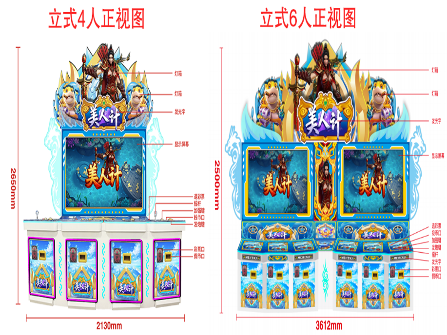 游戏内容简介 | 【美人计(立式)】是为大众娱乐而设计的一款娱乐游戏游艺彩票机,本机支持合法合规的管理系统,也可通过打开微信或支付宝扫一扫管理系统卡头二维码/屏幕二维码/实体二维码扫码支付投币或投入实体游戏代币获得对应的子弹数后玩家即可手动启动游戏.本机适用于网咖、竞技馆、动漫城、商超、台球俱乐部等符合经营许可的使用场所。本游戏是以深海场景+海洋生物+异兽+道具为题材(比如:小黄鱼、小斑鱼、柳叶鱼、蜻蜓鱼、刀片鱼、红叶鱼、流星锤鱼、蓝冰鱼、大眼鱼、小乌龟、尖尾鱼、蝴蝶鱼、围裙鱼、鸭嘴鱼、魔鬼鱼、白色银鲨、黄色金鲨、美人鱼、局部炸弹、一击必杀、组合鱼、能量炮、随机草、天降财神转盘、开心30秒敲鼓、幸运转盘、漂流瓶、同类鱼)等等,多种不同风格的深海场景,众多各具特色的海洋生物/异兽/道具身上蕴藏着无尽的秘密,等待着勇敢的玩家深入探索。在射击过程中击杀龙门等会获得超级大奖,全屏爆炸,体验一场视觉盛宴,让玩家获得丰厚的实物彩票/电子彩票奖励。同时在游戏中,玩家在射击任意海洋生物/异兽/道具时,会消耗子弹数,击杀任何的海洋生物/异兽/道具都会得到该海洋生物/异兽/道具相对应的实物彩票/电子彩票奖励,当玩家子弹数为零时则游戏结束。玩家可用获得的实物彩票/电子彩票,可到店面吧台用彩票/电子彩票兑换精美礼品,电子彩票直接返还到玩家手机上或玩家用手机扫系统二维码/屏幕二维码领取相应奖励,获得实物彩票按经营方合规方式选择心仪的礼品使用(礼品需符合国家法律及当地政策的规定)。同时为了“顺应“互联网+”发展趋势,鼓励娱乐场所与互联网结合发展,实现场内场外、线上线下互动,增强娱乐场所体验式服务”的要求,本设备可以通过物联网技术把实体游戏游艺设备的游戏内容推送到移动端供客人游玩,仅限于从实体设备所在的公众号、小程序、APP及网络推广平台入口进入的玩家游玩。 | ||