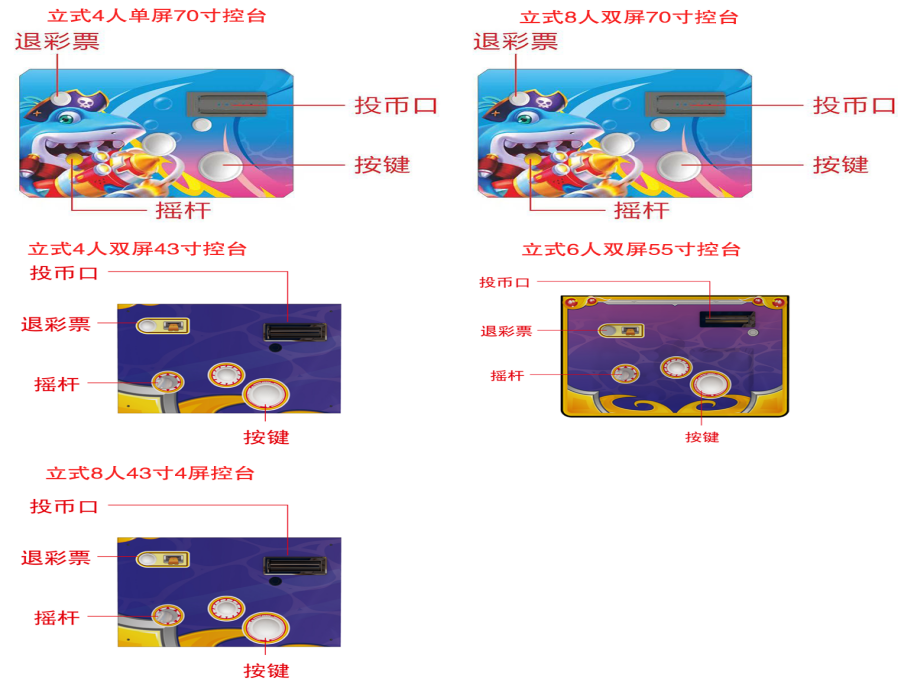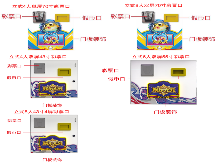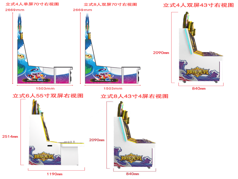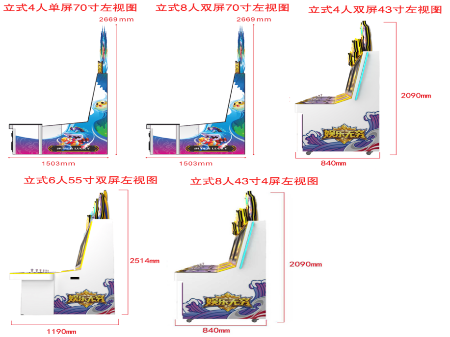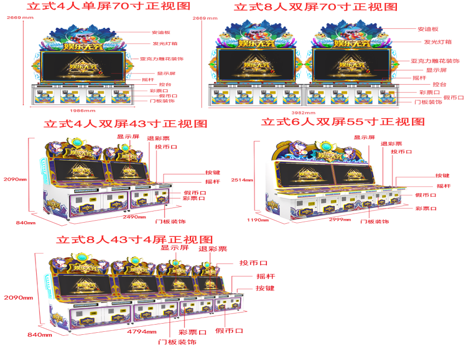 游戏内容简介 | 【娱乐无穷(立式)】是为大众娱乐而设计的娱乐游戏游艺设备,本机支持合法合规的管理系统,也可通过打开扫一扫管理系统二维码/屏幕二维码/实体二维码扫码支付投币或投入实体游戏代币获得对应的子弹数后玩家即可手动启动游戏。本机适用于网咖、竞技馆、动漫城、商超、台球俱乐部等符合经营许可的使用场所。该设备是一款集海洋鱼类,天空飞鸟,卡通昆虫,卡通怪兽,天空战机五大主题的模拟射击类游戏。玩家在游戏中作为猎人的角色,可射击到多种海洋鱼类,包括大迦鳅鱼、小丑鱼、河豚、狮子鱼、乌龟、旗鱼、灯笼鱼、锯齿鲨、组队鱼群,霸王龟,金色龙龟,深海鳄鱼等,鱼儿游过深海、圳瑚、海底的各种奇幻世界。除了让你感受绚丽多彩,缤纷有趣的海底世界外,还能享受到捕获鱼儿的惊喜。本游戏画面逼真、新奇,游戏操作简单、直观。玩家通过遥杆及按键操控发射炮弹,收获射击鱼儿的趣味,打中目标获得相应的奖励,最终按照玩家捕获数量获得彩票。游戏设备超高清晰液晶显示屏,无论是画面精致细腻程度,或者是颜色的协调,还是光影投射的效果,都逼真的近乎完美,加上美妙的音乐,令玩家爱不释手,欢乐无穷。在游戏的过程中,效果绚丽震撼,提供给玩家一个趣味十足的游乐世界,适合成人及亲子娱乐。当以森林天空猎鸟为主题时,玩家犹如进入了鸟的天堂,沉浸在鸟语花香,与五彩缤纷的世界相融,同类鸟,闪电鸟,充满趣味和益智性适合各个年龄段的玩家,在整个冲关过程中锻炼了玩家的手眼协调性和提高玩家注意力。当以卡通昆虫类爬行为主题时,里面包含了三幅场景,分别以枝繁叶茂的夏天,果实累累的秋天以及大雪纷飞的冬天三个场景,并以与三个季节相契合的绿色、黄色、蓝色为主色调的场景打造构成。同时每个场景里面以“可爱卡通”的风格体现了每个季节的虫类动物,以毛毛虫,蜘蛛,螳螂,蝎子,蜜蜂,蚂蚁,蜻蜓等小动物的游玩,突显动态有趣的效果。可通过拍打按键以及配合晃动摇杆的方式进行捕捉,以此来获取对应的彩票数量。游戏里面还有核心boss:蜈蚣 、蜘蛛、蝎子等拥有神奇的能力,击中后将会出现奖励翻倍的效果。游戏不仅充满了趣味性,而且可以锻炼玩家的反应能力和操作能力,每一关卡都会给玩家带来了不一样的体验。当以怪兽为主题时,游戏的地图丰富,游戏开始后多种兽王随机出现,游戏玩家火力集中击杀各种兽王以及boss后可获得相应的能量值,获得的能量可以继续攻击更多魔怪以及boss,游戏玩法生动有趣,在游戏中让玩家挑战自我极限,游戏中出现的妖怪以及boss.万倍轮盘,雷凤凰,火凤凰,雷神,巨型蛛,铁甲战士,天使蛋,地狱三头犬钻头磨,炸弹,闪电虎,狼骑斗士,冰原狼人,旋风怪,巨石人,连环炸弹,魔王随从等。玩家使用子弹,自由选择攻击当前屏幕上出现的妖怪以及boss,游戏过程中不定期的出现妖风清扫,来助力玩家消灭妖怪,击倒兽王,赠送威力强大的神奇武器,玩家既获得体验感,又能提高免疫力,又能获得通关的乐趣,玩家可以使用多种不同的子弹体验多种不同的设计效果。当以游天空战机为主题时,采用先进物理引擎与次世代画质,云层流动、昼夜交替、动态天气等细节拉满沉浸感——雷暴天会干扰雷达,雨天影响能见度,而云层既能隐蔽行踪也能成为伏击战场。从地球大气层到外星基地,丰富关卡设计涵盖消灭敌机、保卫友军、BOSS攻坚等多元目标,敌人将动态调整战术,每一场战斗都充满未知挑战。游戏结束后,玩家可用获得的实物彩票/电子彩票,可到店面吧台用彩票/电子彩票兑换精美礼品,电子彩票直接返还到玩家手机上或玩家用手机扫系统二维码/屏幕二维码领取相应奖励,获得实物彩票按经营方合规方式选择心仪的礼品使用(礼品需符合国家法律及当地政策的规定)。同时为了“顺应“互联网+”发展趋势,鼓励娱乐场所与互联网结合发展,实现场内场外、线上线下互动,增强娱乐场所体验式服务”的要求,本设备可以通过物联网技术把实体游戏游艺设备的游戏内容推送到移动端供客人游玩,仅限于从实体设备所在的公众号、小程序、APP及网络推广平台入口进入的玩家游玩。 | ||