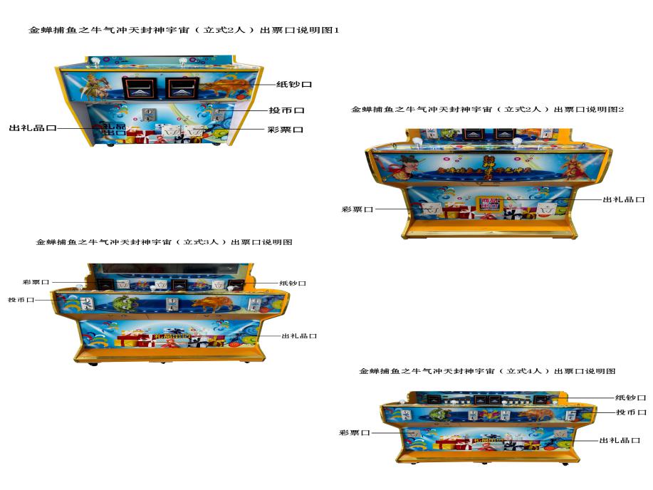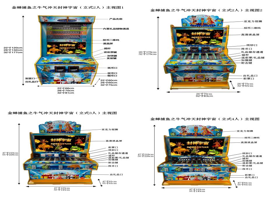游戏内容简介 | 《金蝉捕鱼之牛气冲天封神宇宙(立式)》是为大众娱乐而设计的一款游戏游艺彩票/礼品机,本机支持合法合规的管理系统,也可通过打开微信或支付宝扫一扫管理系统卡头二维码/屏幕二维码/实体二维码扫码支付投币或投入实体游戏代币获得对应的电子积分子弹数后玩家即可手动启动游戏。本机适用于网咖、竞技馆、动漫城、商超、台球俱乐部等符合经营许可的使用场所。本游戏以海洋生物+异兽+道具为游戏题材。(比如鱼类题材一:虾虎鱼、暹罗斗鱼、鳉鱼、气泡鱼、狮子鱼、斑斓鱼、刺豚鱼、蓝吊鱼、灯笼鱼、乌龟、吊尾鱼、蝴蝶鱼、马尾鱼、先锋鱼、海藻、魔鬼鱼、金鲨、银鲨、胖头鲨、金龙、闹钟局部炸弹、金蝉、金麒麟、屠龙刀一击必杀、能量炮、各类型鱼类组合鱼、深海铠甲鳄鱼、超级财神天降财神彩金等等。鱼类题材二:虾虎鱼、暹罗斗鱼、鳉鱼、气泡鱼、狮子鱼、斑斓鱼、刺豚鱼、蓝吊鱼、灯笼鱼、乌龟、吊尾鱼、蝴蝶鱼、马尾鱼、先锋鱼、海藻、魔鬼鱼、金鲨、银鲨、小龙虾、金麒麟、火凤、黑牛、红牛、金牛、绿蟾、蟠桃集满五个送彩金、六尾狐、仙鹤、黑龙、大象、姜子牙全屏炸弹、三头狼全屏炸弹、美人鱼、小哪吒局部炸弹、随机彩金送一到五位、随机JP大奖、老虎送彩金、金象送彩金、螃蟹激光炮、螃蟹钻头炮、螃蟹连环炸弹、能量炮、莲花送幸运色盅、莲花送幸运转盘、旋风鱼王、旋风鱼、闪电连锁、各类型鱼类组合鱼等等。鱼类题材三:虾虎鱼、暹罗斗鱼、鳉鱼、气泡鱼、狮子鱼、斑斓鱼、刺豚鱼、蓝吊鱼、灯笼鱼、乌龟、吊尾鱼、蝴蝶鱼、马尾鱼、先锋鱼、海藻、魔鬼鱼、金鲨、银鲨、老鹰集满五个送彩金、红牛同生共死、美人鱼、仙鹤送彩金、超级红牛、棕牛、银龙、黑牛、金象全屏炸弹、孙悟空全屏炸弹、随机JP大奖、随机彩金送一到五位、海藻、金牛送福彩金、双龙刀火箭一击必杀、莲花台送无敌炸弹、莲花台送幸运转盘、莲花台送幸运宝箱、莲花台送开心拍拍乐30秒、莲花台送幸运色盅、各类型鱼类组合鱼等等)。由多种不同风格的场景,众多各具特色的海洋生物/异兽/道具身上蕴藏着无尽的秘密,等待着勇敢的玩家深入探索,体验一场视觉盛宴。在射击过程中击杀深海铠甲鳄鱼、姜子牙全屏炸弹、三头狼全屏炸弹、金象全屏炸弹、孙悟空全屏炸弹可以获得超级大奖,让玩家获得丰厚的电子积分/彩票奖励。本设备同时支持多台联机游玩,设备亚克力头顶可拆卸。同时在游戏中,玩家在射击任意海洋生物/异兽/道具时,会消耗电子积分子弹数,击杀任何的海洋生物/异兽/道具都会得到该海洋生物/异兽/道具相对应的电子积分/彩票奖励,当玩家电子积分子弹数为零时则游戏结束。玩家可用获得的积分奖励手动选择退实物彩票/电子彩票/礼品/礼品卡,到店面吧台用实物彩票/电子彩票/礼品卡兑换精美礼品。玩家也可以选择退电子彩票直接返还到玩家手机上,也可以用手机扫卡头/屏幕二维码领取电子彩票,都可以链接到电子商城上选择心仪的礼品使用电子彩票/礼品卡兑换。同时为了“顺应“互联网+”发展趋势,鼓励娱乐场所与互联网结合发展,实现场内场外、线上线下互动,增强娱乐场所体验式服务”的要求,本设备可以通过物联网技术把实体游戏游艺设备的游戏内容推送到移动端供客人游玩,仅限于从实体设备所在的公众号、小程序、APP及网络推广平台入口进入的玩家游玩。 | ||