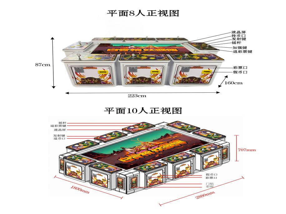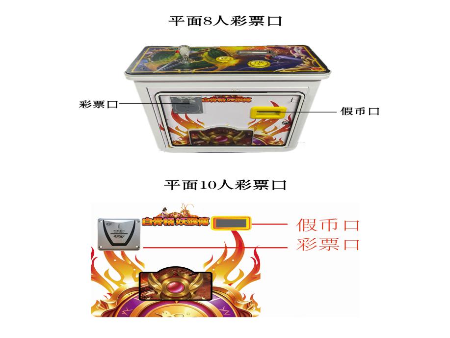 游戏内容简介 | 《白骨精妖猴傳(平面8/10人)》是为大众娱乐而设计的一款射击类游戏游艺彩票机,本机支持合法合规的管理系统。也可通过打开微信或支付宝扫一扫管理系统卡头二维码/屏幕二维码/实体二维码扫码支付投币或投入实体游戏代币获得对应的游戏分数和子弹数后玩家即可手动启动游戏。本机适用于网咖、竞技馆、动漫城、商超、台球俱乐部等符合经营许可的使用场所。本游戏是以多场景+海洋生物+异兽+道具为题材(比如:红绿灯鱼、蓝魔鱼、黄曼龙鱼、五彩琴尾鱼、蝴蝶鱼、公子小丑鱼、刺鲀、七夕斗鱼、凤梨鱼、橙壳海龟、斑马小丑鱼、幻彩水滴鱼、翡翠蝴蝶鱼、深蓝魔鬼鱼、咖啡斑点蝠鲼、银纹月光鱼、火焰异形鱼、烈焰凤凰、毒沼鳄王、深渊巨蟹、雷霆海豚、黄金食人鱼、黄金战牛、双生碧霄马、玄铁蛮牛、烈焰蟠龙、全屏炸弹、局部炸弹、觉醒、击爆送超级大奖、击爆送转乾坤彩金、彩金大奖、天降财神、随机草、超级大奖、一击必杀、JP1、财神、开心30秒、幸运宝箱、幸运色盅、无敌炸弹、连环炸弹、钻头炮、电磁炮、红鱼组合、三元、四喜)等等,由多种不同风格的场景,众多各具特色的海洋生物+异兽+道具身上蕴藏着无尽的秘密,等待着勇敢的玩家深入探索,体验一场视觉盛宴。同时在游戏中,玩家在射击任意海洋生物+异兽+道具时,会消耗游戏分数和子弹数,击杀任何的海洋生物+异兽+道具都会得到该海洋生物+异兽+道具相对应的彩票/电子彩票奖励,当玩家游戏分数和子弹数为零时则游戏结束。玩家可用获得的游戏分数手动选择退实物彩票/电子彩票/礼品积分卡,到店面吧台用实物彩票/电子彩票/礼品积分卡兑换精美礼品。玩家也可以选择退电子彩票/彩票直接返还到玩家手机上,也可以用手机扫卡头/屏幕二维码领取电子彩票/彩票,都可以链接到电子商城上选择心仪的礼品使用电子彩票/彩票/礼品积分卡兑换。同时为了“顺应“互联网+”发展趋势,鼓励娱乐场所与互联网结合发展,实现场内场外、线上线下互动,增强娱乐场所体验式服务”的要求,本设备可以通过物联网技术把实体游戏游艺设备的游戏内容推送到移动端供客人游玩,仅限于从实体设备所在的公众号、小程序、APP 及网络推广平台入口进入的玩家游玩。 | ||