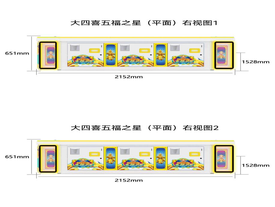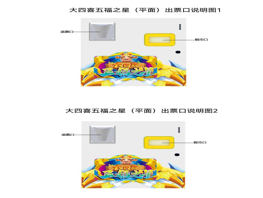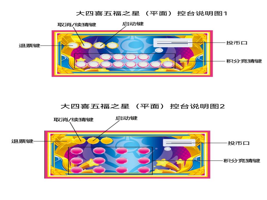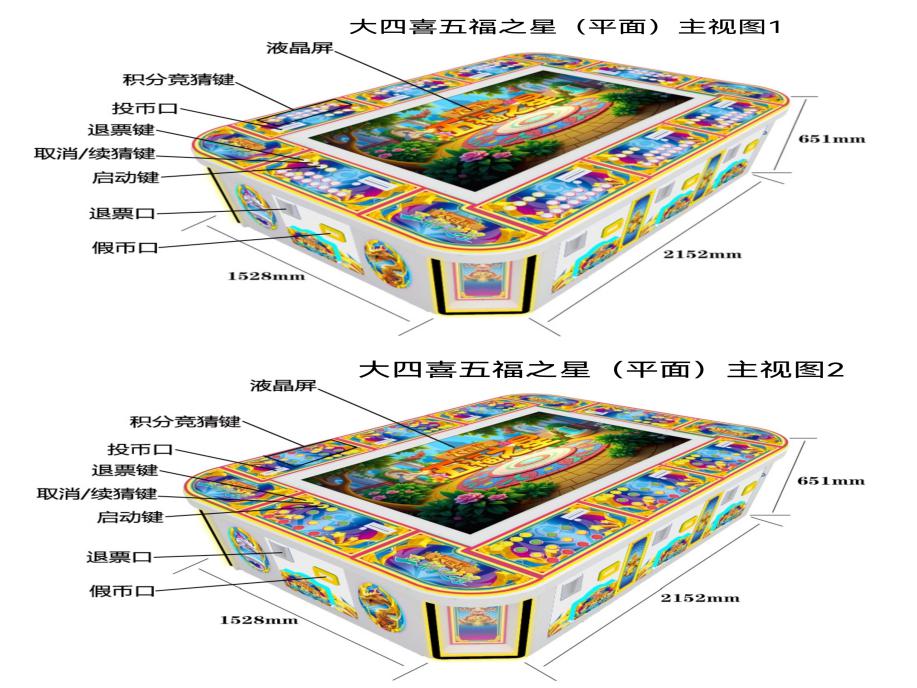 游戏内容简介 | 大四喜五福之星(平面)是为大众娱乐而设计的一款娱乐游戏游艺竞猜型彩票机。本机支持合法合规的管理系统,也可通过打开微信或支付宝扫一扫管理系统卡头二维码/屏幕二维码/实体二维码扫码支付投币或投入实体游戏代币等方式获得对应的电子竞猜积分彩票票数后玩家即可开始游戏。本机适用于网咖、竞技馆、动漫城、商超、台球俱乐部等符合经营许可的使用场所。本游戏以全新的玩法,丰富的卡通动物角色,游戏中每一个角色都拥有不同的效果技能,给大家体验一个全新的竞猜类娱乐游戏。游戏可选四种游戏题材。动物题材一:森林之王狮子、国宝熊猫、顽皮猴子、大耳朵小兔子、空中霸主老鹰、孔雀、信使鸽子、燕子、金龙、银龙等。水果题材二:苹果、西瓜、芒果、桔子、钻石、双77、双星、三颗星、铃铛以及各种小游戏等。车标题材三:兰博基尼,奔驰,宝马,奥迪等。动物题材四:森林之王狮子(红色、绿色、黄色、金色)、国宝熊猫(红色、绿色、黄色)、顽皮猴子(红色、绿色、黄色)、大耳朵小兔子(红色、绿色、黄色)等。游戏开始前,各种角色在屏幕内显示出来,玩家需要给自己喜欢的角色以及角色的颜色进行电子竞猜积分彩票票数注入,游戏开始后,画面内进行快速旋转转圈然后缓慢停止,当完全停留在任意一种角色以及角色的颜色时,则本局游戏结束。当画面完全停留在任意一种角色以及角色的颜色同时是游戏开始前玩家进行竞猜积分彩票票数注入的角色以及角色的颜色的颜色,则玩家获得本局该角色以及角色的颜色相对应的电子积分/彩票票数奖励。玩家给喜欢的角色以及角色的颜色进行电子竞猜积分注入的彩票票数的不同,获得该角色以及角色的颜色相对应的电子积分/彩票票数奖励也就不同。机器游戏内容里面还为玩家们准备了各种送奖游戏不定时大放送(例如送角色:同一种角色的所有颜色全中得票。送颜色:同一个颜色的所有角色全中得票。彩金:系统随机赠送游玩位置获得高额彩票票数。大满贯:系统赠送所有游玩位置四种角色以及所有的角色颜色同时中票。幸运JP:双幸运号。幸运送灯:系统随机赠送一到五个角色等等)可以让玩家可以获得海量电子积分/彩票票数奖励。游戏结束后,玩家可用获得的电子积分彩票票数手动选择退实物彩票/电子彩票,到店面吧台用实物彩票/电子彩票兑换精美礼品。玩家也可以选择退电子彩票直接返还到玩家手机上,也可以用手机扫卡头/屏幕二维码领取电子彩票,都可以链接到电子商城上选择心仪的礼品使用电子彩票兑换,填写正确的收货地址,商城将礼品通过快递送达。同时为了“顺应“互联网+”发展趋势,鼓励娱乐场所与互联网结合发展,实现场内场外、线上线下互动,增强娱乐场所体验式服务”的要求,本设备可以通过物联网技术把实体游戏游艺设备的游戏内容推送到移动端供客人游玩,仅限于从实体设备所在的公众号、小程序、APP及网络推广平台入口进入的玩家游玩。 | ||