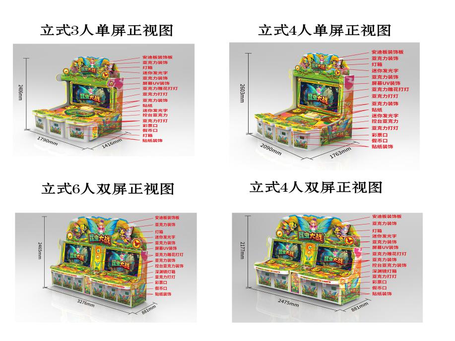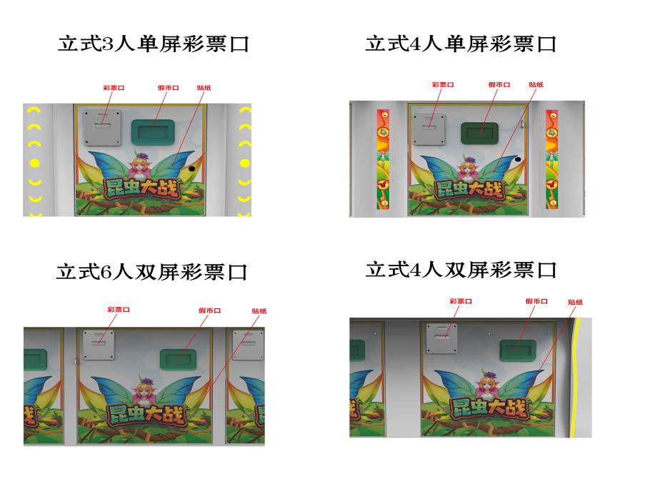 游戏内容简介 | 《昆虫大战(立式3/4/4/6人)》是为大众娱乐而设计的一款射击类游戏游艺彩票机,本机支持合法合规的管理系统,也可通过打开微信或支付宝扫一扫管理系统卡头二维码/屏幕二维码/实体二维码扫码支付投币或投入实体游戏代币获得对应的游戏分数和子弹数后玩家即可手动启动游戏。本机适用于网咖、竞技馆、动漫城、商超、台球俱乐部等符合经营许可的使用场所。玩家在游戏中作为猎人的角色,可射击到多达30种昆虫类,包括(黄黑帝王蝶、C型装甲甲虫、红点七星瓢虫、蓝宝石甲虫、号翠绿纺织娘、棕榈象鼻虫、粉晶蜻蜓、虎纹蜜蜂、紫铜金龟子、彩虹叩头虫、银斑天牛、橙翅蝗虫、黑武士螳螂、荧光跳蚤、红锯锹甲、孔雀吉丁虫、幽灵竹节虫、棕黄斑蝶、霓虹蜻蜓、虎纹蜂、蓝闪蝶、黄蜂战甲、局部炸弹、全屏炸弹、组合虫子、雷霆炸弹、离子炮、一击必杀、开心30秒)等等,各式各样、五颜六色的昆虫在天空中自由自在的翱翔。玩家通过操控摇杆控制方向,和按键确定能量炮,发射能量光球,射击这些不同的昆虫进行捕捉游戏。个别昆虫身上带有不同的小游戏,有的昆虫身上带有能量,捕捉到以后,可以加强能量光球的威力,更加大范围的捕捉昆虫。有的昆虫身上带有爆炸功能,在被捕捉后触动爆炸,连同身边的昆虫一起被炸到被捕捉,玩家能得到更多的彩票奖励。本游戏画面逼真、新奇;操作简单、直观;游戏中有诸多的小游戏。同时还有超炫的特效,给玩家带来不一样的视觉享受。本游戏操作简单有趣,最终按照玩家捕获数量获得彩票奖励,提供给玩家一个趣味十足的游乐世界。本游戏画面逼真、新奇;游戏操作简单、直观;游戏设备超高清晰液晶显示屏,无论是画面精致细腻程度,或者是颜色的协调,还是光影投射的效果,都逼真的近乎完美,加上美妙的音乐,有各种昆虫在休闲游戏,音乐轻柔衬托,给玩家带来有身临其境感觉。玩家在游戏的过程中可欣赏到昆虫们在森林追逐互动所带来的自身的真实感受。体验射击游戏精彩带来的喜悦,让玩家回味无穷。提供给玩家一个趣味十足的游乐世界,适合成人及亲子娱乐。同时为了“顺应“互联网+”发展趋势,鼓励娱乐场所与互联网结合发展,实现场内场外、线上线下互动,增强娱乐场所体验式服务”的要求,本设备可以通过物联网技术把实体游戏游艺设备的游戏内容推送到移动端供客人游玩,仅限于从实体设备所在的公众号、小程序、APP 及网络推广平台入口进入的玩家游玩。 | ||
