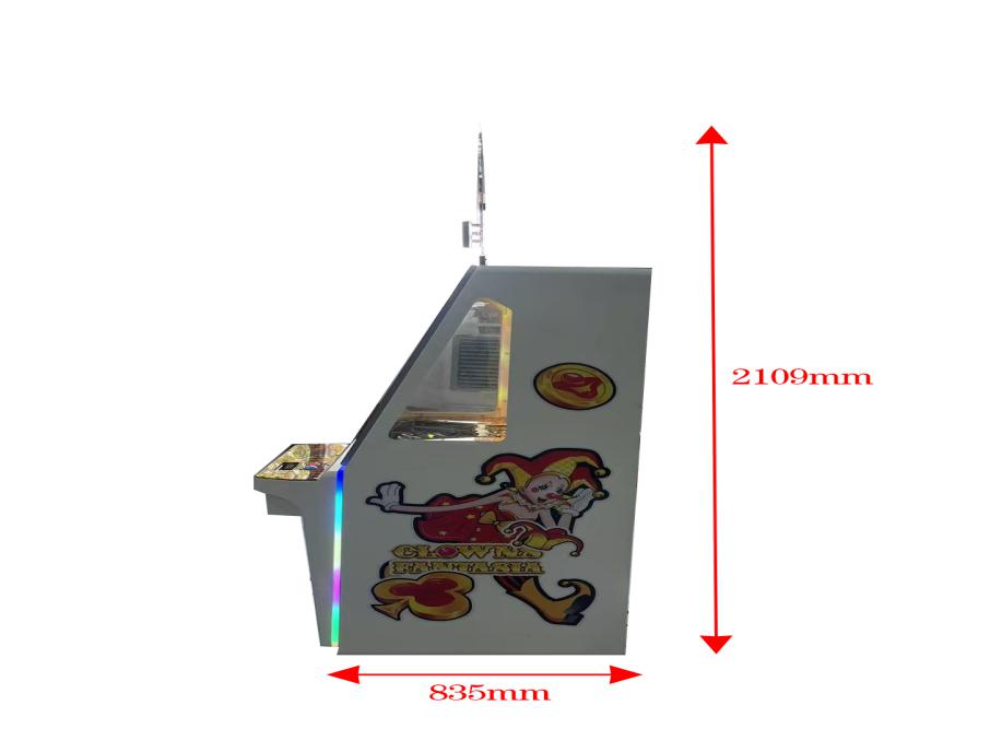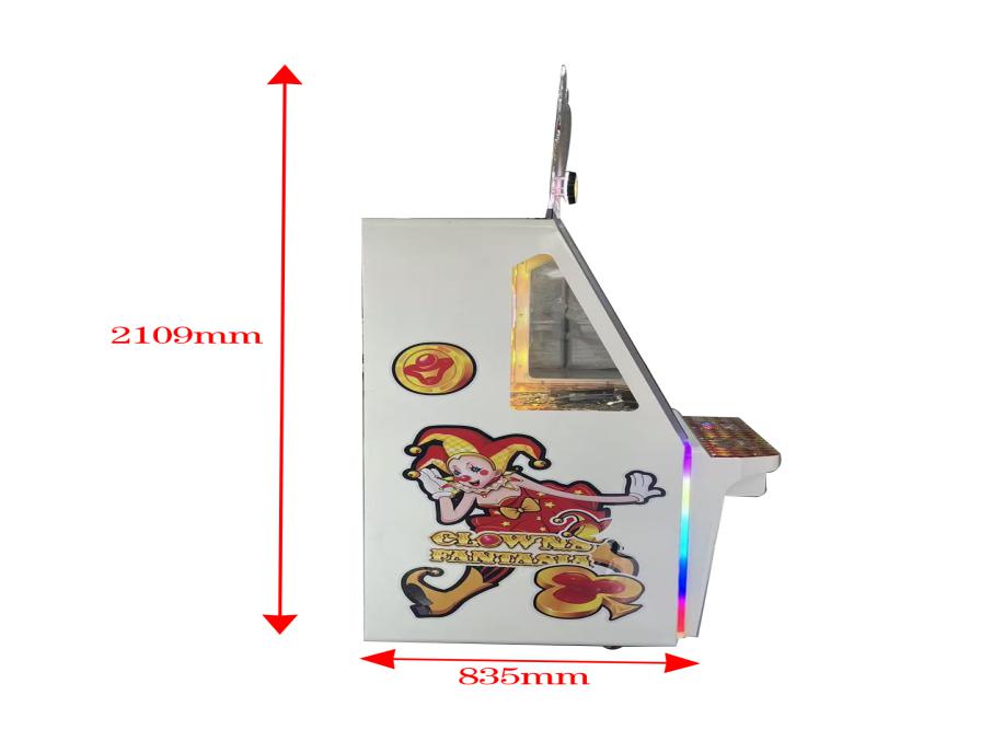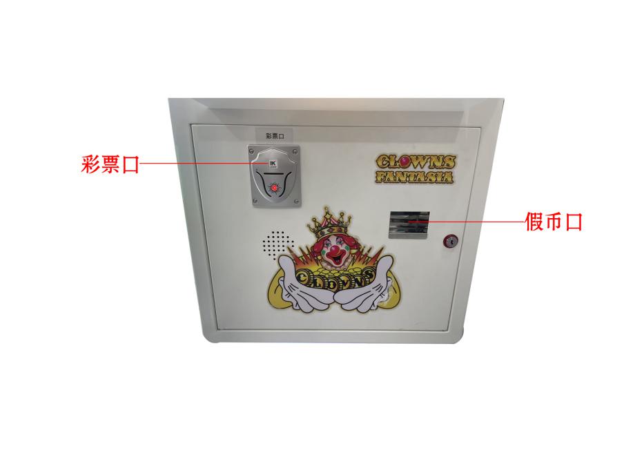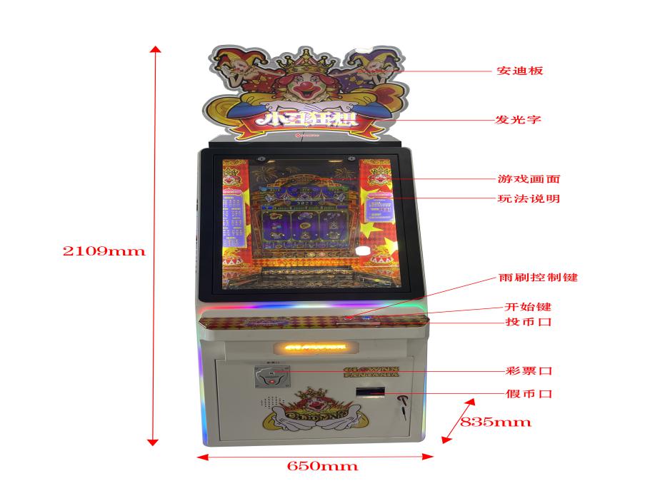 游戏内容简介 | 《小丑狂想(立式)》“小丑狂想”推币机是一款以为海洋卡通主题的游戏设备,立足于流行的经典推币机游戏的基础游戏规则,根据市场运营的需求发展趋势,添加了许多新的游戏逻辑和元素。本机支持合法合规的管理系统,也可通过打开微信或支付宝扫一扫管理系统卡头二维码/屏幕二维码/实体二维码扫码支付投币或投入实体游戏代币后玩家即可开始游戏。本机适用于网咖、竞技馆、动漫城、商超、台球俱乐部等符合经营许可的使用场所。上币币斗中的币经上币电机驱动吸入上币币道,上币币道终端弹簧给予代币一个初速度弹出,经上币光眼,弹出币后,玩家参与操作雨刷轨道控制代币的掉落初始方向,代币通过是否撞击掉币板的挡针改变下落方向,掉落轨迹如果从移动镖靶的中心通道通过则产生一次9宫格滚动变化图案排列(“滚奖”)的机会,最后通过8个水果通道之一,掉到推盘上方,推盘往返运动,将持续掉落的币推到二级平台,二级平台的代币将在玩家面前经过推盘推币进入落币斗,该掉落的代币将通过回币电机,回币币道终端的回币光眼将计数所通过的币数,回币器所回的币通过回币轨槽滑回上币斗中,完成代币的“内循环”过程后转为“彩票”最终返回给玩家。机型分为:单机位、四人位和五人位三款:同时玩家可用获得的彩票奖励手动选择退实物彩票/电子彩票,可到店面吧台用彩票/电子彩票兑换精美礼品,也可以用手机扫卡头/屏幕二维码领取电子彩票/彩票,都可以链接到电子商城上选择心仪的礼品使用彩票/电子彩票兑换,填写正确的收货地址,商城将精美礼品通过快递送达。同时为了“顺应“互联网+”发展趋势,鼓励娱乐场所与互联网结合发展,实现场内场外、线上线下互动,增强娱乐场所体验式服务”的要求,本设备可以通过物联网技术把实体游戏游艺设备的游戏内容推送到移动端供客人游玩,仅限于从实体设备所在的公众号、小程序、APP及网络推广平台入口进入的玩家游玩。 | ||