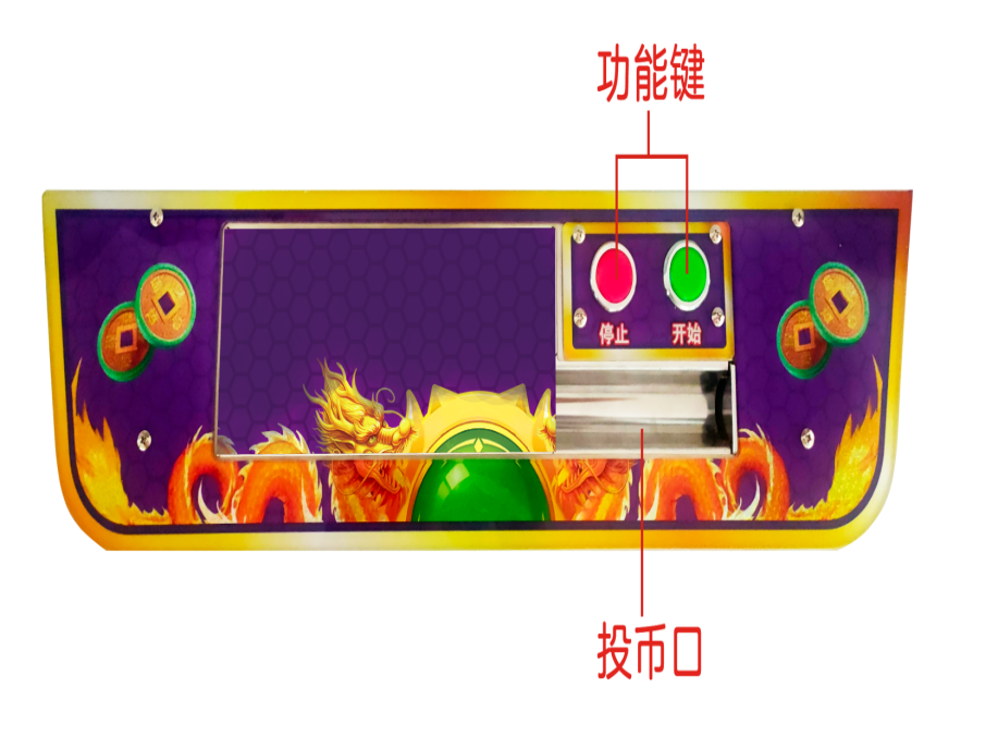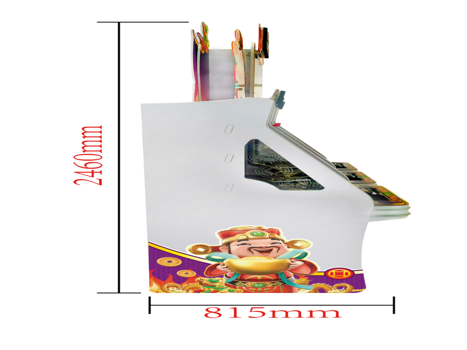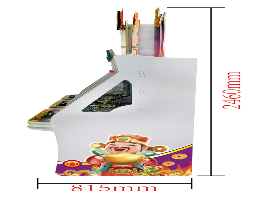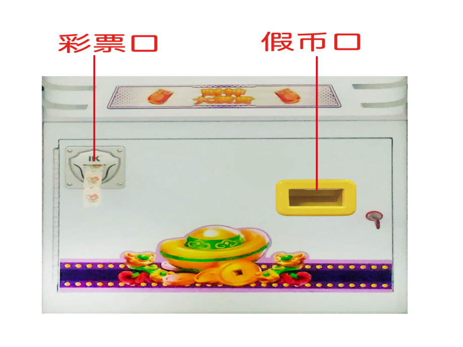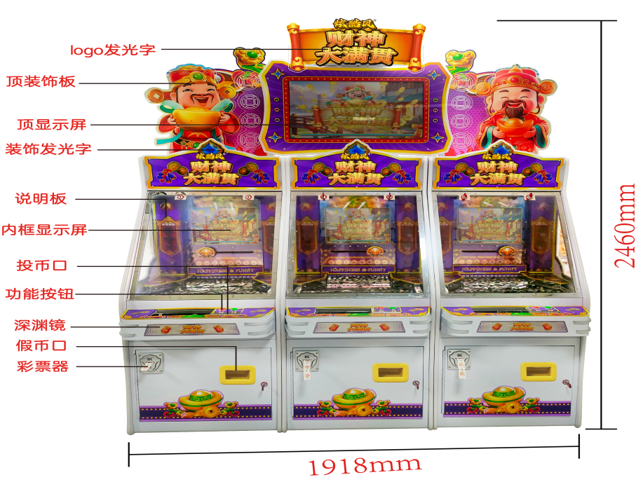 游戏内容简介 | 2.《炫酷风财神大满贯》为方便客人游玩,便于主管部门监管,本设备可以扫码投币以及获得电子彩票或积分,积分可以到周边商家及线上商城消费(具体按当地主管部门要求来执行)。为响应文市发【2016】26号文件内容:“鼓励娱乐场所与互联网结合发展,实现场内场外、线上线下互动,增强娱乐场所体验式服务”的要求,本设备通过物联网技术可把实体游戏游艺设备的内容,推送到移动端供客人游玩,限于从实体设备所在游艺场所的公众号、小程序、APP及网络推广平台入口进入的客人游玩,不向全网开放。本设备功能网络使用和销售同样有效;《炫酷风财神大满贯》配有立式3人连线机型、可连接30位。《炫酷风财神大满贯》该游戏游艺设备以财神主要题材,融入堆币叠币推推乐的游戏玩法,包含了非常丰富的喜庆元素:如财神、百搭、龙头、朱雀、如意、鼓、灯笼、鞭炮、红包、铜钱;让整个游戏感受到浓浓的关于财神喜庆的气息。设备只退彩票不退币掉落的游戏代币只在机器内部循环不会掉落在机器外部。这款设备的游戏技巧有两个方面,第一技巧是玩家通过确认键将雨刷停在合适的角度,绕开钉板以控制游戏代币掉落到自己想要的位置,第二个技巧就是玩家要掌握时机,在合适的时机快速投币使币掉落在左右移动的幸运通道里,来启动屏幕里的小游戏,从而获得更多代币奖励掉落到堆盘。如果落入幸运通道,则启动屏幕小游戏:福星转运、步步高升、金币探宝、JP1、JP2、JP3,当有三个财神图案出现在屏幕不同的位置时,就获得小游戏的额外奖励,获得更多从机器最顶端掉代币奖励到堆盘;如果游戏代币直接掉落到堆盘时,则堆盘推动游戏代币前进和叠加,当游戏代币滑落堆盘时,玩家可获得彩票奖励。 3.位数:1-3人位。 | ||